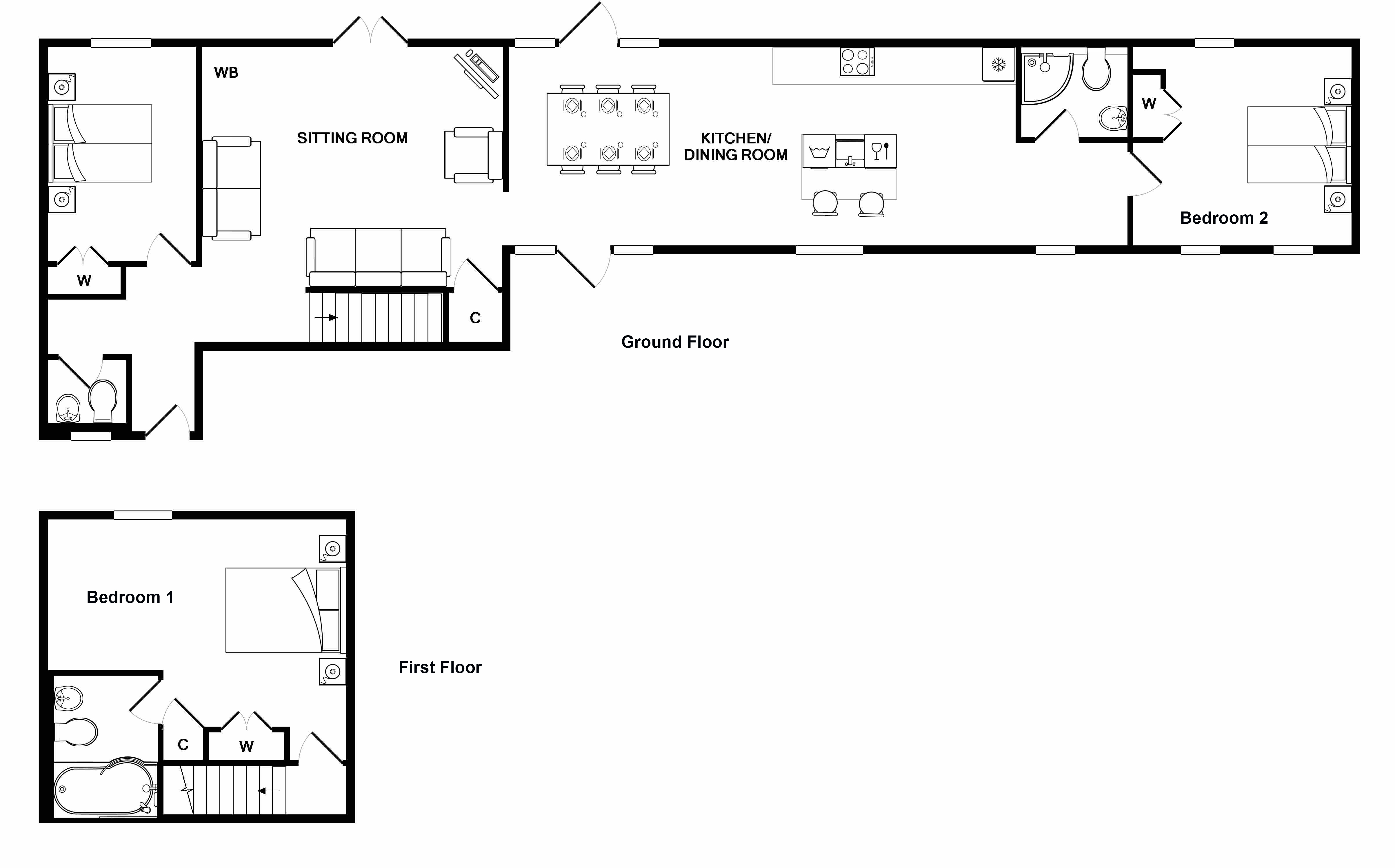 A ground floor room that can have a super king or twin beds. It has a WC directly opposite and shares a shower room with Bedroom 2. Sleeps 2.